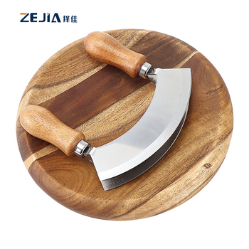Tabla de Cortar Redonda de Madera de Acacia y Cuchillo Mezzaluna, Cuchillo Picador de Hierbas de Madera con Tabla de Cortar, Cortador de Hierbas Curvo de 2 Cuchillas
